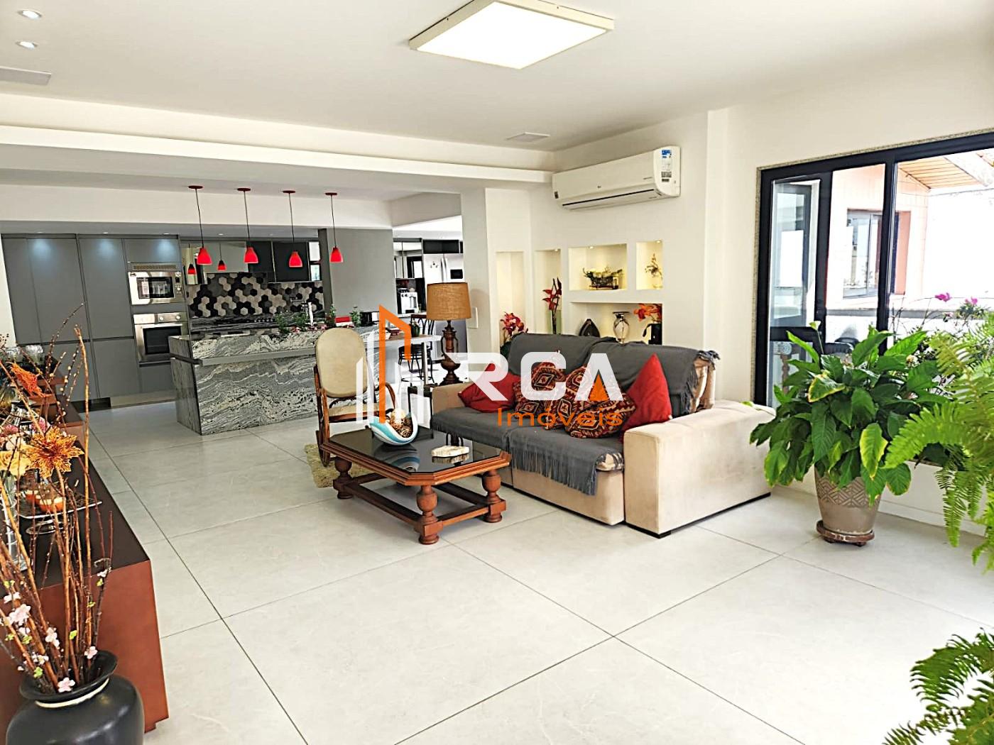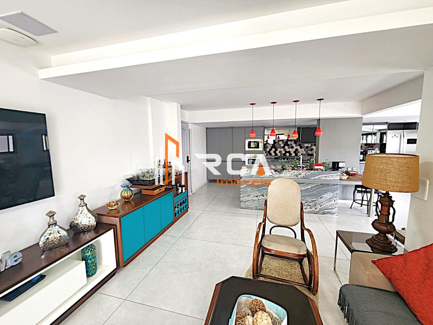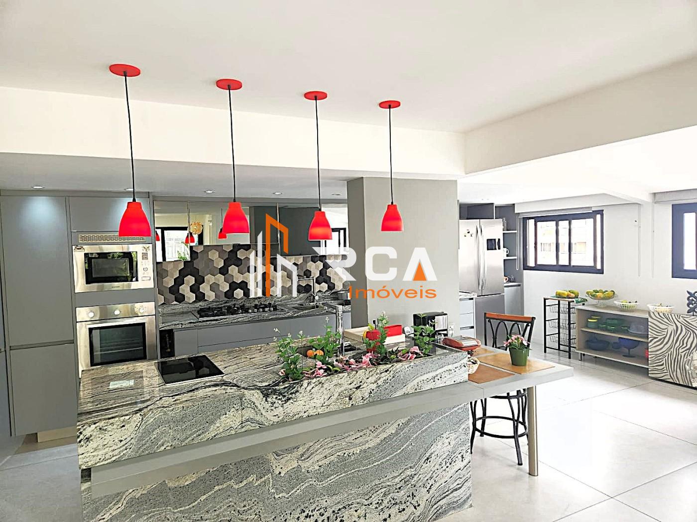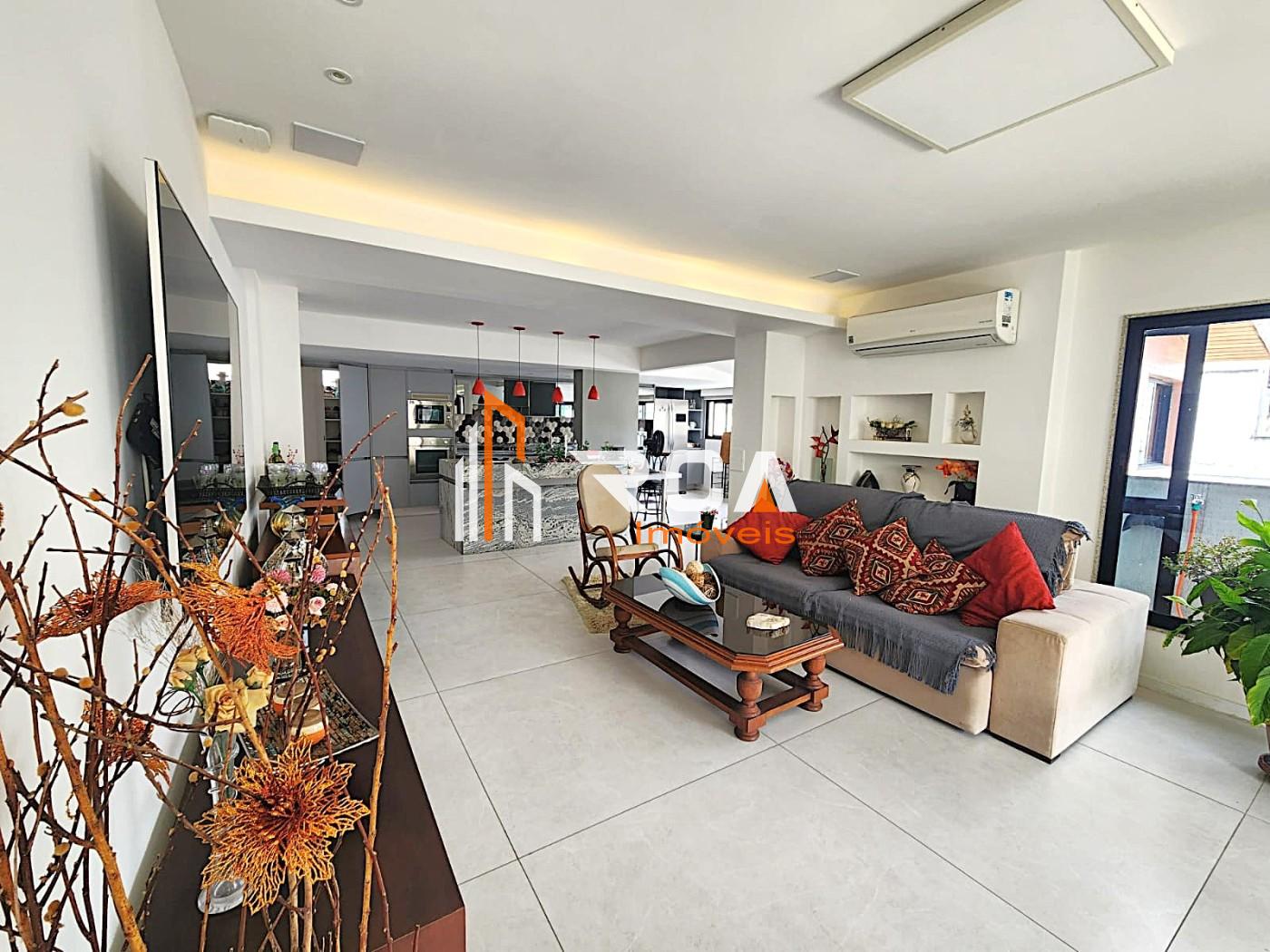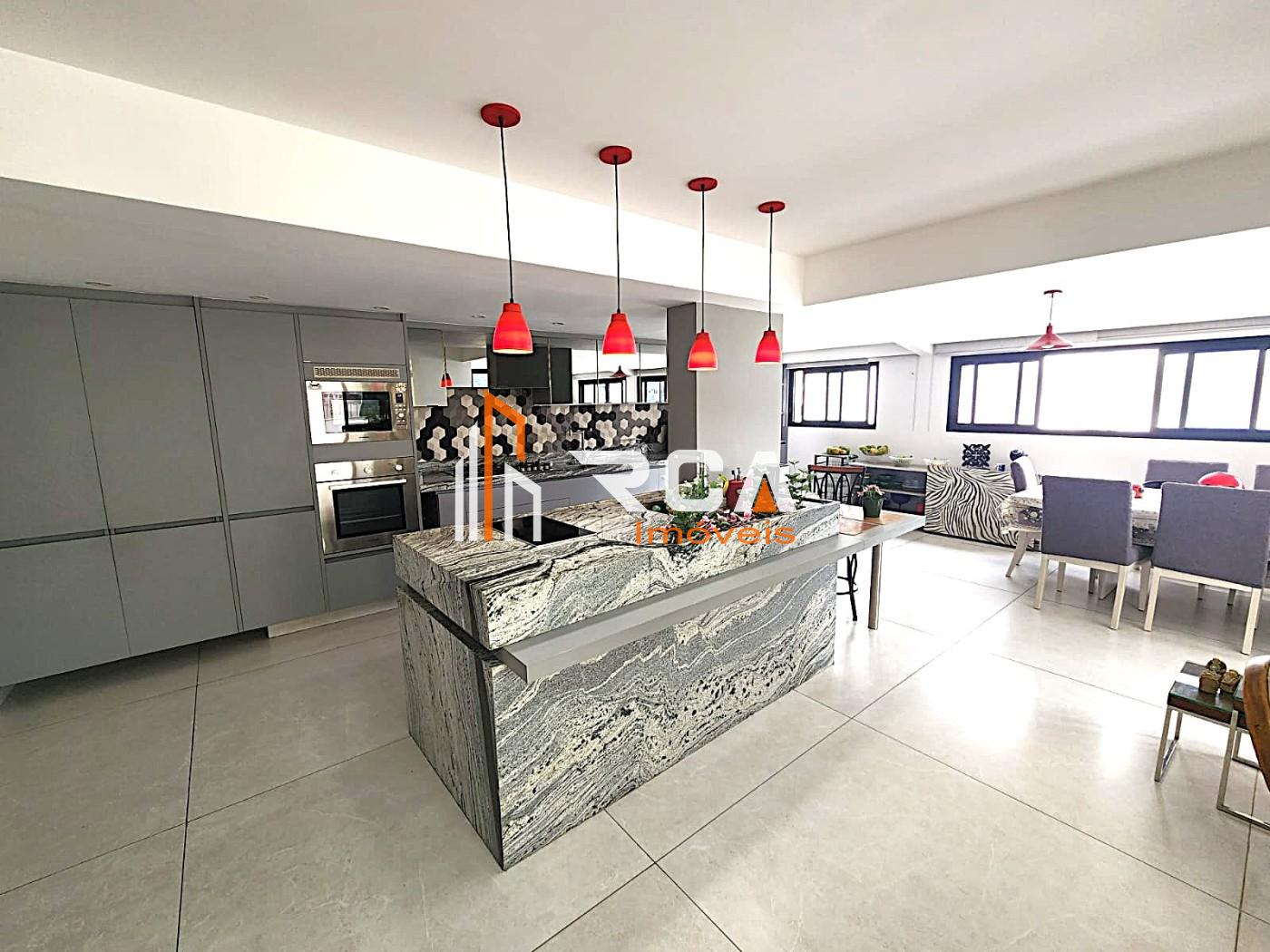 A área social conta com uma ampla sala em três ambientes, integrada em conceito aberto com uma elegante cozinha com ilha central, trazendo modernidade e funcionalidade ao espaço.