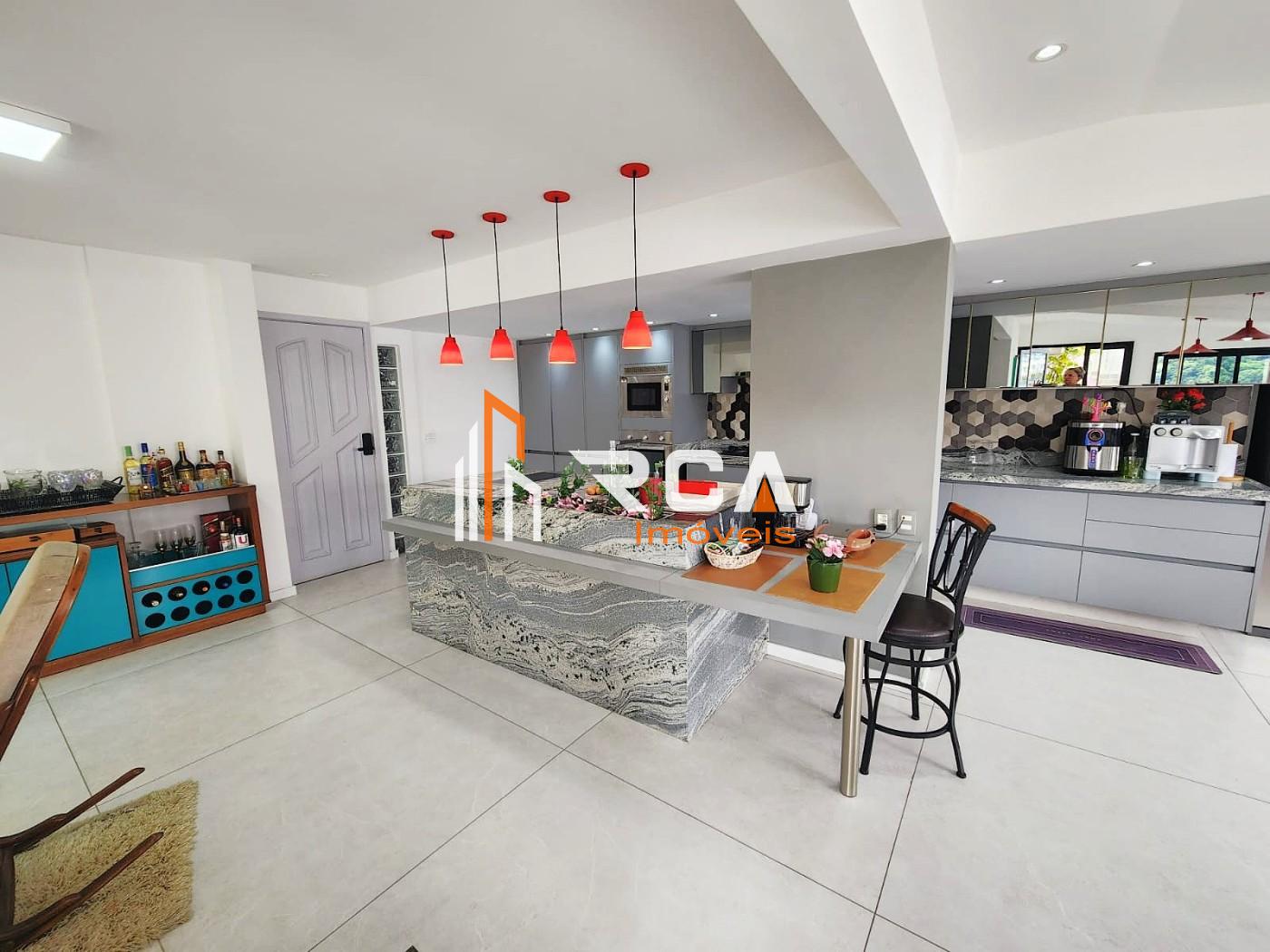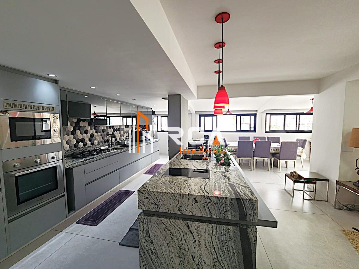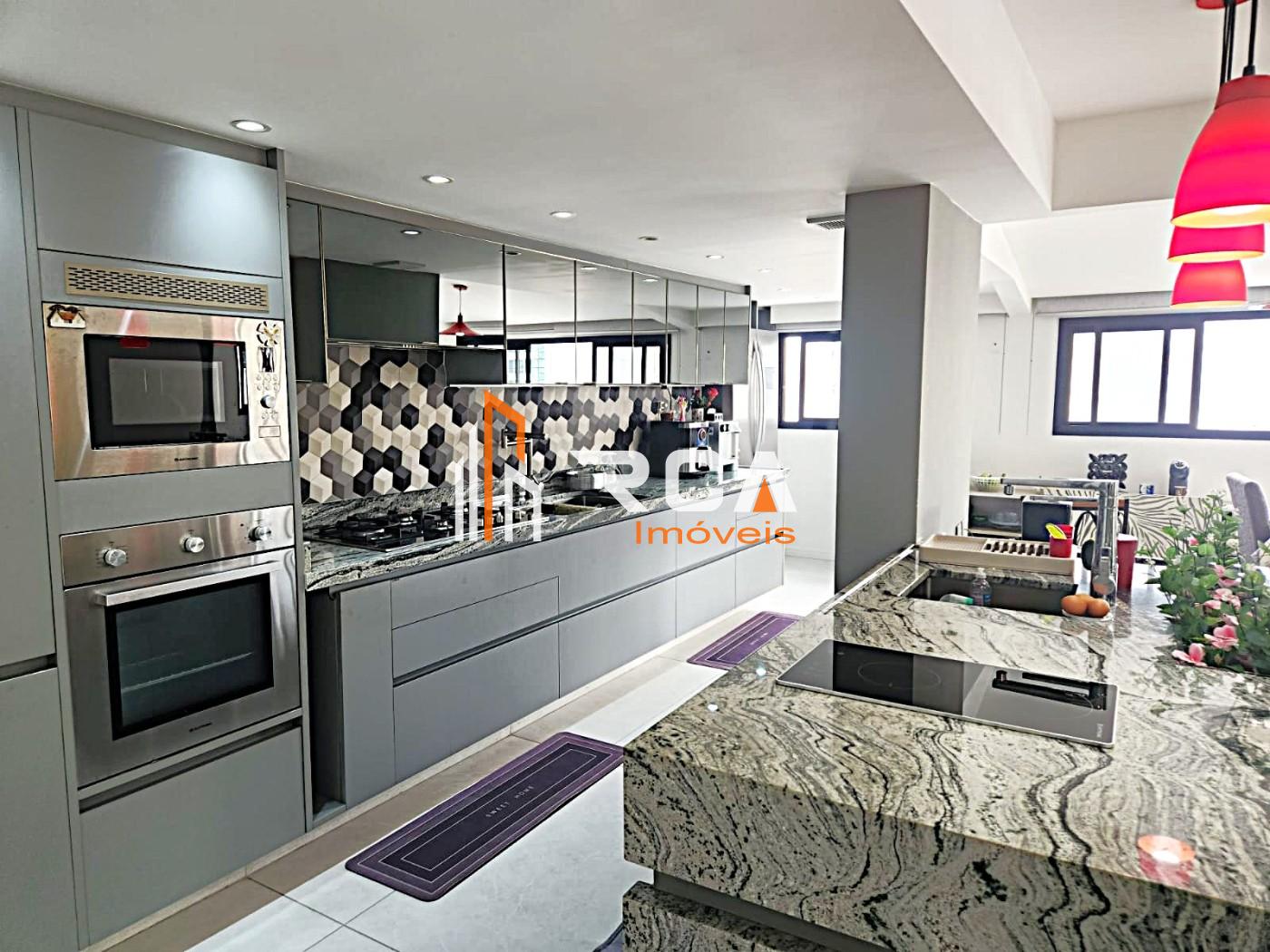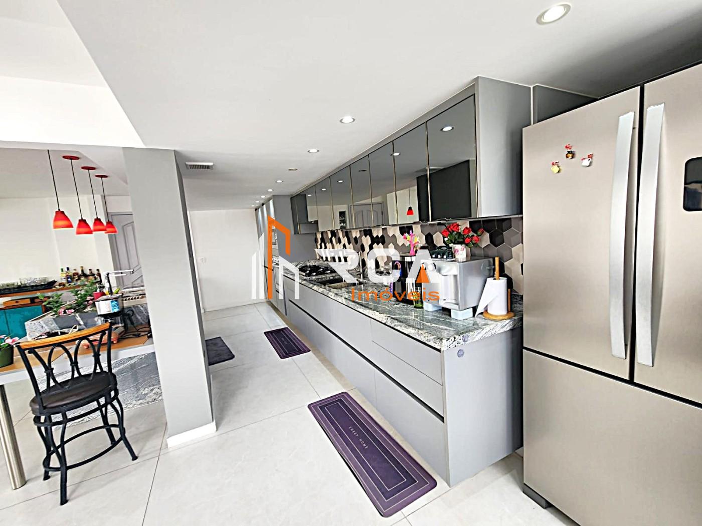 A área social conta com uma ampla sala em três ambientes, integrada em conceito aberto com uma elegante cozinha com ilha central, trazendo modernidade e funcionalidade ao espaço.