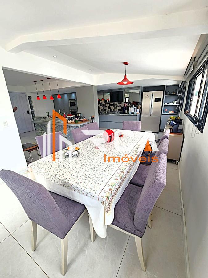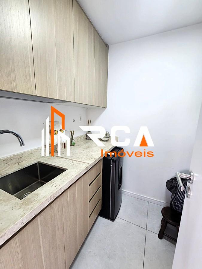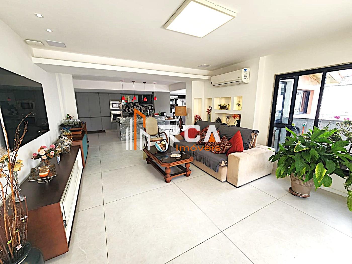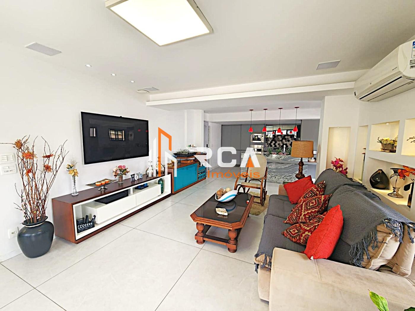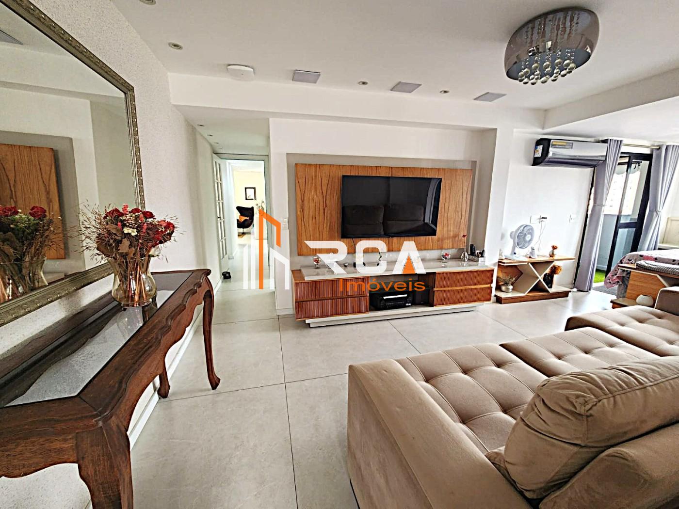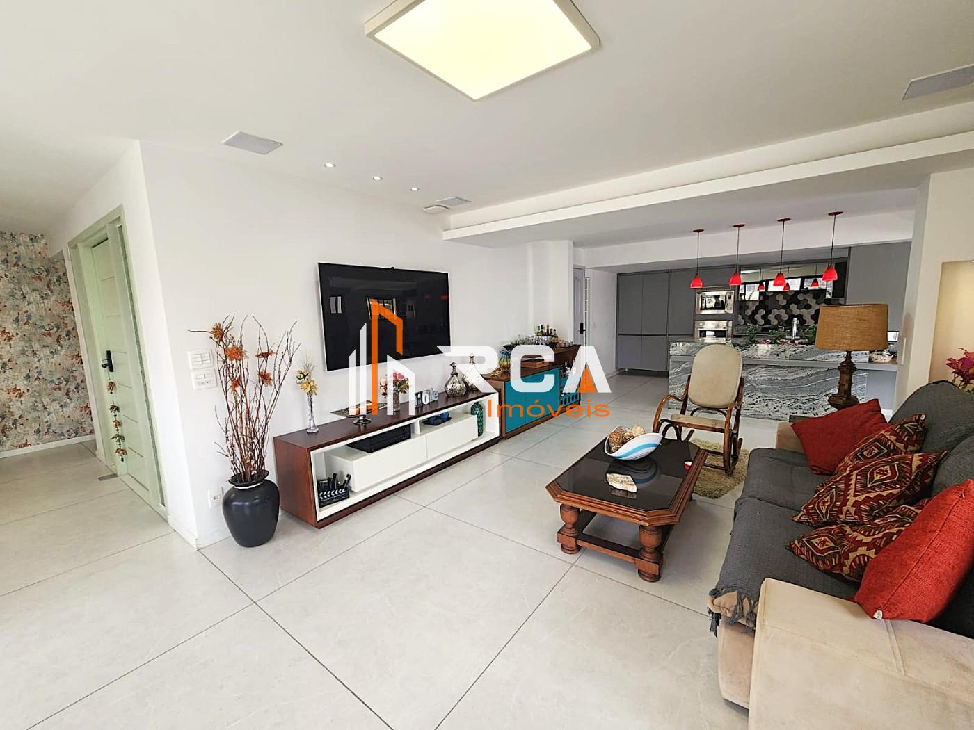 A área social conta com uma ampla sala em três ambientes, integrada em conceito aberto com uma elegante cozinha com ilha central, trazendo modernidade e funcionalidade ao espaço.